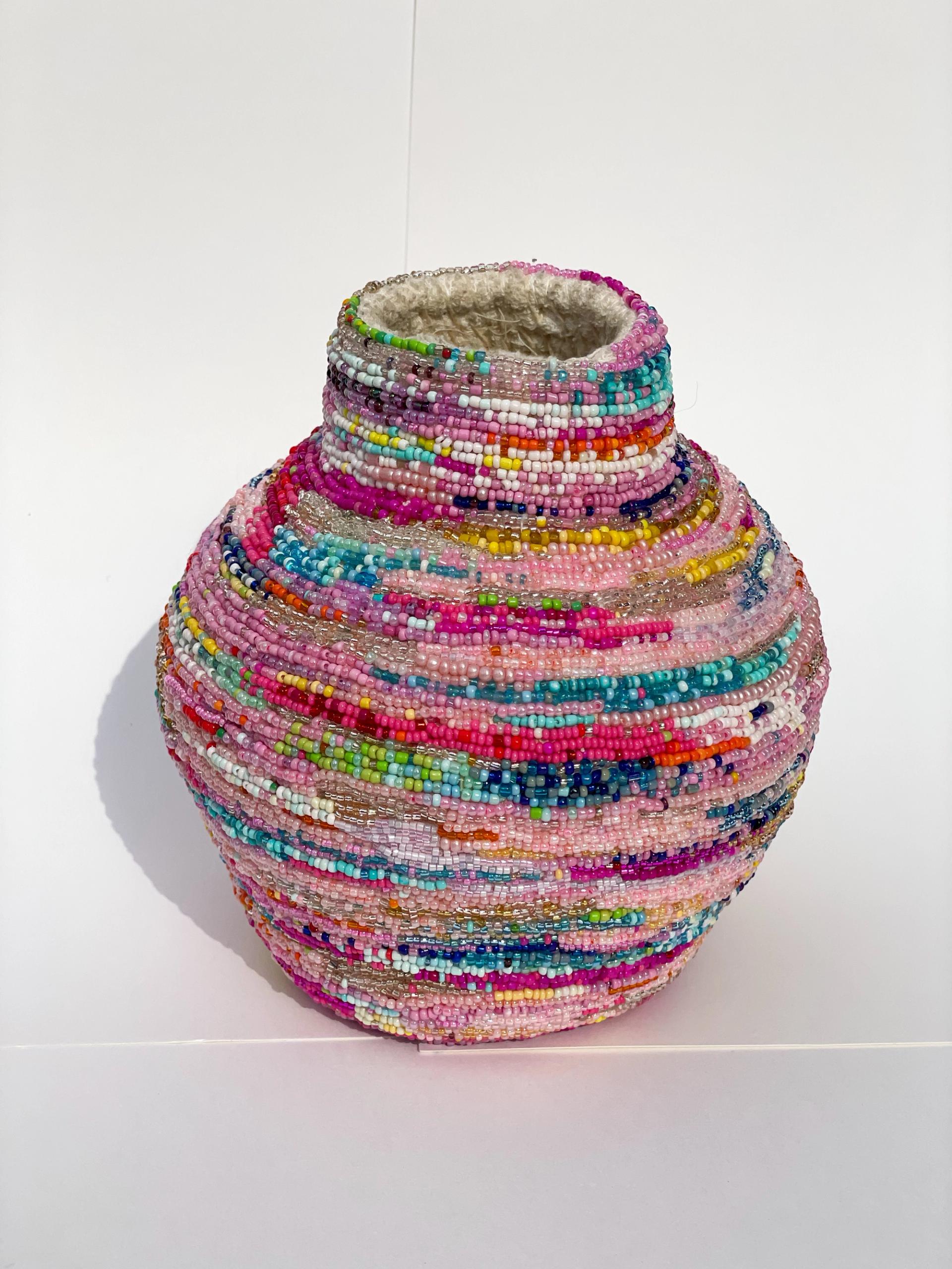 Sienna Barton is a Naarm-based painter and textile artist. Graduating from the MFA program at RMIT University in 2022, her artistic practice is obsessive and time-consuming. Often serving as a means of soothing fidgety fingers, her work seeks to transform anxious energy into tangible works of art. Her textile works utilise discarded materials from local clothing labels and her own wardrobe, while others are collected by her grandparents during their weekly trips to the op shop. This diptych seeks to explore the relationship between craft and “women’s work”, the value of replicas, and the hierarchy of craft and high-art. Using thousands of hand-sewn seed beads, Pretend Basket is far more valuable than the work it’s imitating.