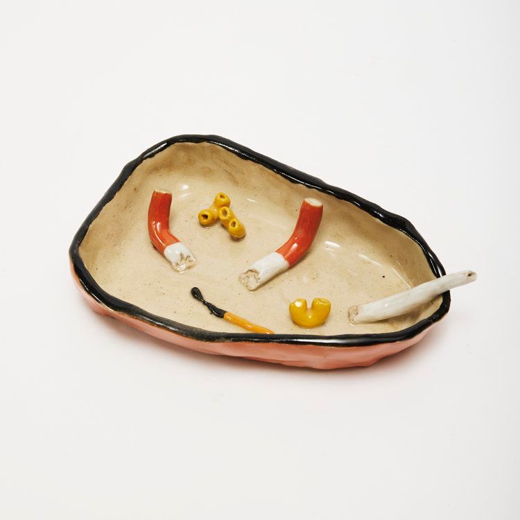 Flore Faucheux is a multidisciplinary artist, trained outside of academic circuits. Since 2020, she has dedicated her practice to ceramics, working with stoneware in an unconventional way. With prolific flow, solitary production methods, and a blend of diverted scales and comedic results, she reimagines and recreates the artifacts of our time. Flore Faucheux organizes her life in a cyclical fashion. She alternates between long-term travel and committing to residencies in creative spaces – occupying many places that enrich the repertoire of all the mundane and magical things she sees and captures. Currently, she works at Sous Terre[1] to bring out the markers of our time. By reproducing the packaging of objects, she highlights modes of consumption and existence specific to our society in the here and now. A way for the artist to find in her practice a space of her own that can be communicated and understood by everyone. By choosing visual elements that characterize the places she passes through – a cigarette packet on an empty table, a dirty sock stranded in the corner of an apartment, a discarded lottery ticket tossed on the sidewalk – she glorifies these phantom objects and draws up a meticulous inventory of a world in the full bloom of transformation. Her colourful and shiny pieces rewrite the relationship we have with everyday objects and their uses - offering a delicate awakening to the poetry of possession. [1] Ceramic studio located in the 10th arrondissement of Paris.