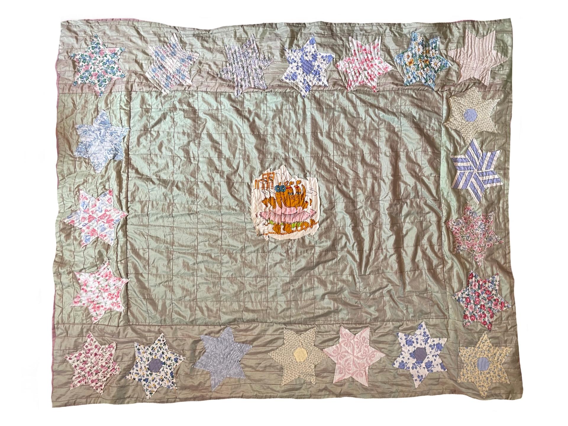 Born and raised in Melbourne, Australia, Ruby Hoppen holds a BFA, studying in Montreal at Concordia University and back home at RMIT. Juggling family life and an art practice, Hoppen has exhibited her work locally and internationally and runs quilt making workshops. She lives and works in Melbourne with her two kids. Using mostly found materials and scraps, Hoppen makes her quilts using an instructional framework informed by oral history and symbolism. Hoppen playfully investigates the tropes of ‘women’s work’, pokes fun at domesticity and the under-appreciated nature of the Gentle Arts by manipulating found images in old bedsheets and scraps of fabric. By reimagining the role of the woman artist as social commentator, she uses these images to draw out the discarded corners of human existence. Donated clothing, mass produced cartoon printed sheets from a stranger’s childhood, whether it is stained or sun bleached or ripped and discarded, no scrap goes unused.