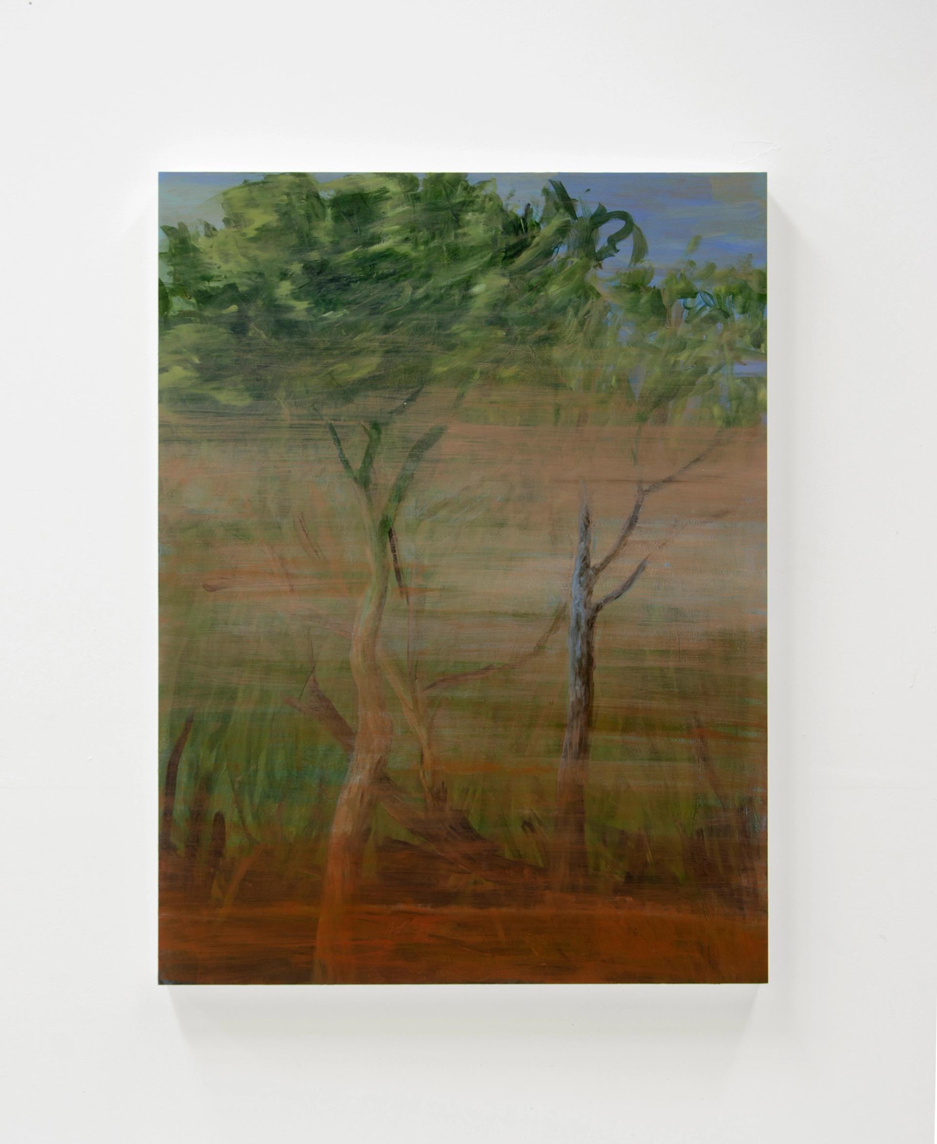 ‘I’m interested in the materiality of paint and how through thin washes of colour, I’m able to capture veils of movement and transition. ‘Standing in Motion’ explores feelings of impermanence, the uncanny and draws from the elusiveness of memory. In an expressive process of layering paint, I recall the evocative colours at dusk & the movement of the Dorrobbee Grasslands on Widjabul Wiabal land. The light tipped grasses reach up toward the sky, bending and leaning in.’